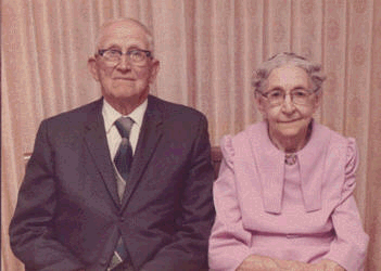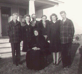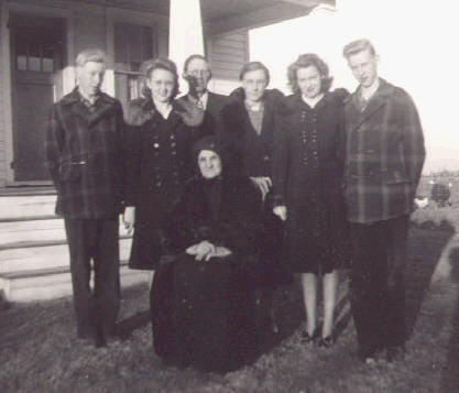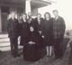 Carl, Lottie, George, Dena, Lucile, Emmet Brakensiek all standing behind Wilhelmina Giessmann
