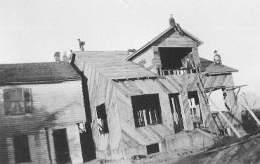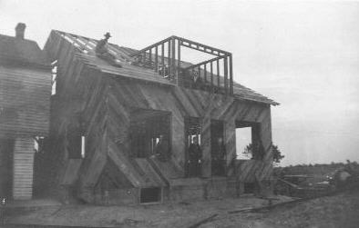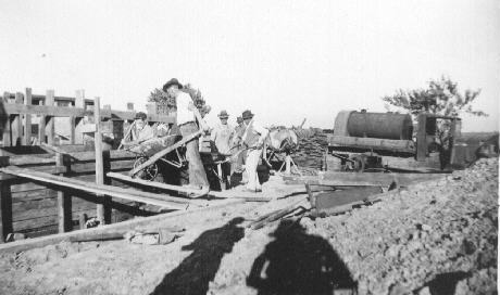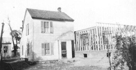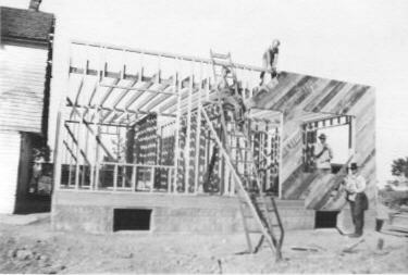 The basement and walls were poured in two days. Herman Freese had made the concrete mixer out of a barrel. Water was in the truck seen on the photo. Gravel was hauled to the site in Model T trucks owned by George Freese and Herman.