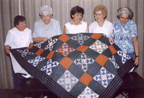 Quilting is one of Emily's favorite hobbies. Emily with one of the MANY quilts she has assisted with. This one is the '98 quilt made by the Women's Fellowship to be raffled off at the annual Capplen Church Picnic.
