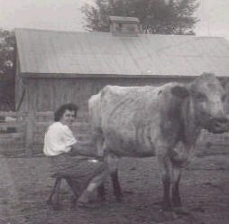 This photo was sent to Lawrence while he was in the service. Patsy was a direct descendant of the cow given to Mabel's parents(Herman & Lydia) in 1922 as a Wedding Present from her mother's parents(August & Wilhelmina). When her parents were driving the cow home, a man offered her parents $200 for the cow and they refused the money.
