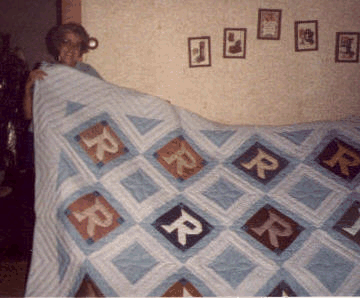 Mabel has quilted many, many quilts, throws, pillows or runners for presents. Many were a log cabin variations, Double Wedding Ring, Lone Star, etc.,etc.
