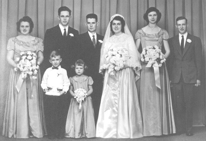 Hattie Busdieker, Dale Busdieker in front of Ray Freese, Kathy Busdieker in front of Lawrence, Mabel, Marilyn Holt, Emmet Brakensiek