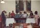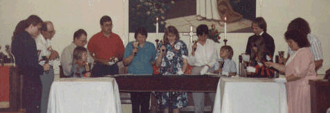 The grandchildren, spouses and greatgrandchildren playing the handbells in church dedicated in memory of Herman and Lydia Freese