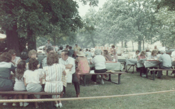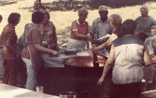 AN ANUAL PICNIC REMEMBRANCE: In the beginning, the beef was started immediately after church, Alvin Almeling had the beef there, and the beef would be done by 4pm. There were 2 kettles of beef, 1 of coffee, eggs were used to keep coffee grounds in a lump, everyone brought 2 fried chickens, some potato salad, and 2 pies. The slaw was made at church. When cutting pies, stacks of four were cut with a butcher knife, and left on one plate to serve. There were at least 5 tables under the one long shelter to eat. Branches with leaves were used to chase flies from the food. A 1915 Picnic Ad