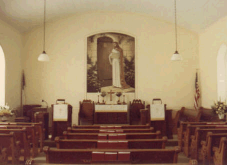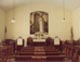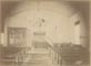 Above the high pulpit behind the upper part of chandelier is a shal deckel, it was a hood type canopy above the minister to help direct his voice to the congregation. A Hymn board can be seen behind the lower part of the chandelier. The offering poles are on both sides of the pulpit. A swivel chair is in front the the pipe organ. Shades can be seen on the windows. One of several lamps, can be seen in front of the right window. Two Hymn boards, an offering pole, and one of the original wall lamps are displayed in the Sunday School house today.