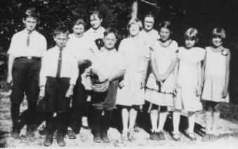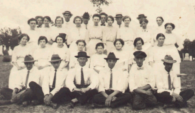 3rd row: ? Fuerman, Pete Joerling, Lottie Brakensiek, Laura Joerling, Sidonia Brakensiek, Elsie Linnenbringer, Bud Sherman, Elmer Tucker, ?, Elwood Busdieker