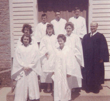 back: Ernst Ellerman Jr., Larry Paul, Dale Busdieker middle: Geneva Helvey, Christine Brakensiek, Cheryl Nadler, Rev. Winnecke front: Mary Bohlen, Lois Winnecke