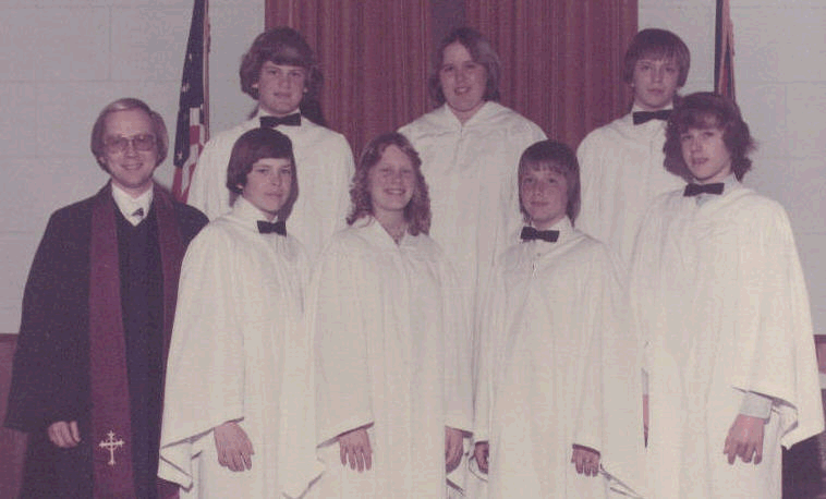 Pastor Jones, Dean Micke in front of Todd Joerling (Fr), Glenda Brakensiek, Tina Schmidt, Scott Welge (Fr), Bill Freese, Ron Rector (Fr)