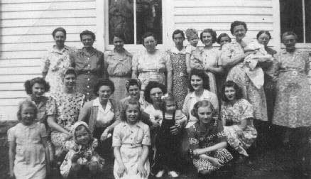 Back: Lydia Freese, Ella Brandes, Clara Wildschuetz, Clara Holt, Hulda Webbink, Margaret Ellerman holding Delbert, Martha Micki, Mabel Schmidt holding George, Clara Brakensiek, Louisa Schmidt Middle: Mabel Schuester, Marilyn Holt, Doris Thieman, Wilma Micki, Josie Schiemeier holding Jolleen Schiemeier, Mildred Mabel Schuester, Beulah Borgelt, Front: Hazel Wildschuetz, Elaine Welke, Shirley Ellerman, Alice Freese