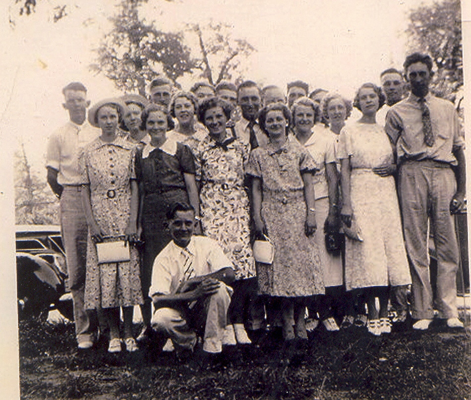 front row: Elmer Tucker, Lawrence Busdieker, Emmet Brakensiek, Carl Brakensiek, Vernon Linnenbringer, Roy Schweissguth, Mabel Freese,