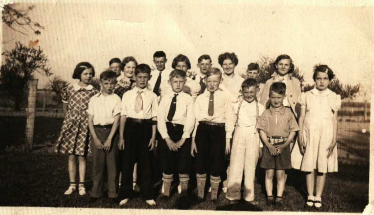 back row: Marilyn Holt, Elwood Busdieker, Elda Linnenbringer, Arlie Schemmer, Alverda Schemmer, Lawrence Joerling, Grace Freese, Bobby Parks, Laura Joerling,