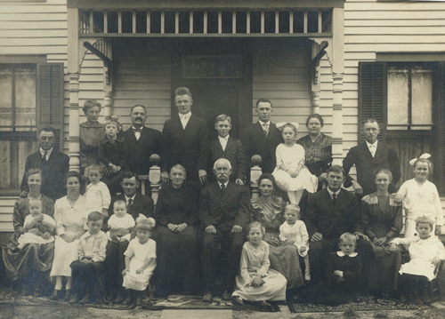 front: Lydia (Engelage) Lagemann holding Vera, Clara (Engelage) Brakensiek, Lester, Raymond, Emil Brakensiek, holding Leland, Mildred, Eliza (Schaechter) Engelage, Henry Engelage, Helen, Hilda (Dickmann) Engelage, Eldon, Herman Engelage, Leslie, Emma (Engelage) Groeneman, Florence, Esther