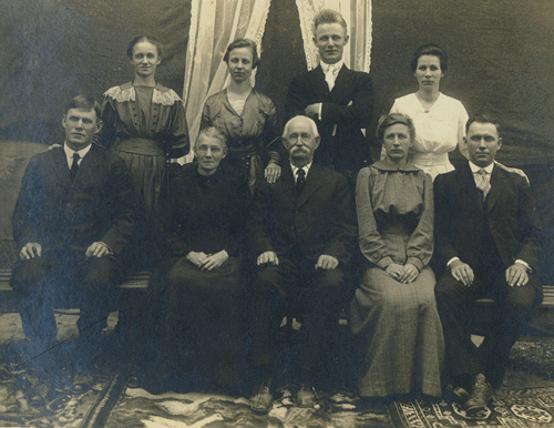 back: Fred Lagemann, Della (Engelage) Ruebling, Alberta, Albert Ruebling, Oswald Engelage, Harold Engelage (son of Herman), Gustaf Engelage, Revonia, Olga (Berg) Engelage, Henry Groeneman