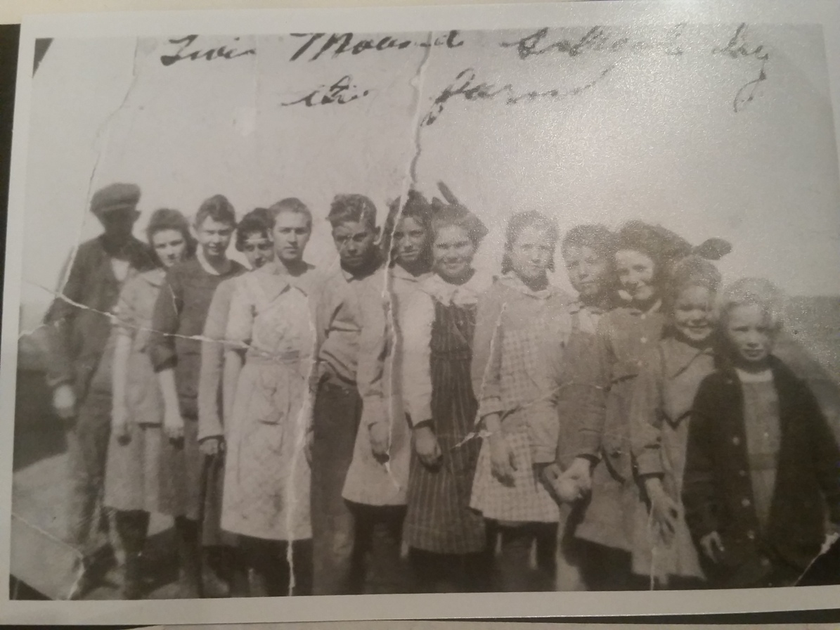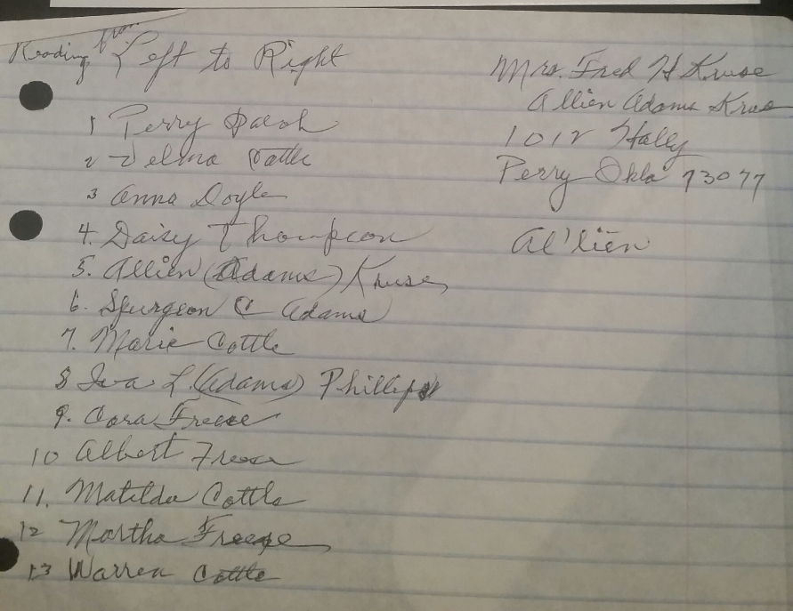 left to right: Perry Paoh, Velma Cottle, Anna Doyle, Daisy Thompson, Allien (Adams) Kruse, Spurgeon C. Adams, Marie Cottle, Iva L. (Adams) Phillips, Cora Freese, Albert Freese, Matilda Cottle, Martha Freese, Warren Cottle