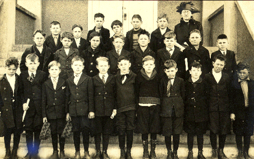 Inscription on back: "Dear Grandpa. This is me and My Sunday School Class, we have 25 boys in our class. I put a blue dot under me see if you know me. Walter Freese