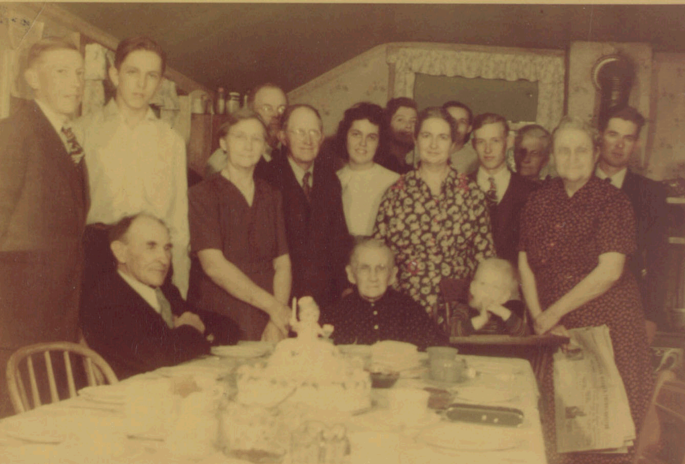 George Freese, Wilhelmina, Glennon Kidd at the Table. Carl Brakensiek, Ray Freese, Dena Brakensiek, Herman Freese, George Brakensiek, Mabel Freese, Connie Freese, Lydia Freese, Sam Freese, Emmet Brakensiek, Selma Williams, Ida Freese, and Lawrence Busdieker
