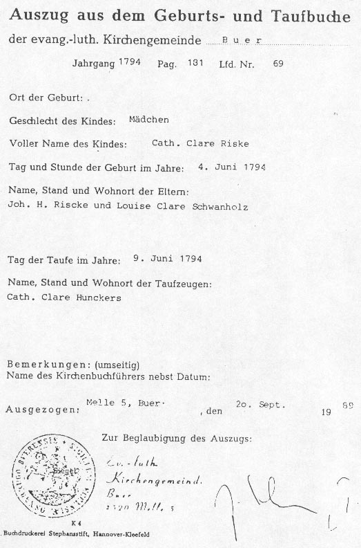 Hired hand Johann Heinrich Riske and his legal wife Louise Clara born Schwanholz (The residence of the parents is not given)