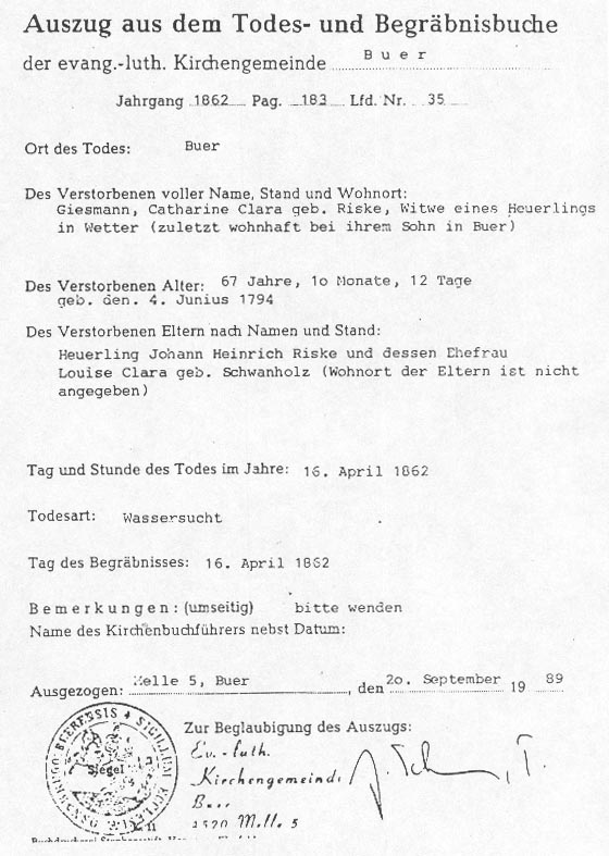 Giesmann, Catharine Clara born Riske, widow of a hired hand in Wetter (last lived with her son in Buer)