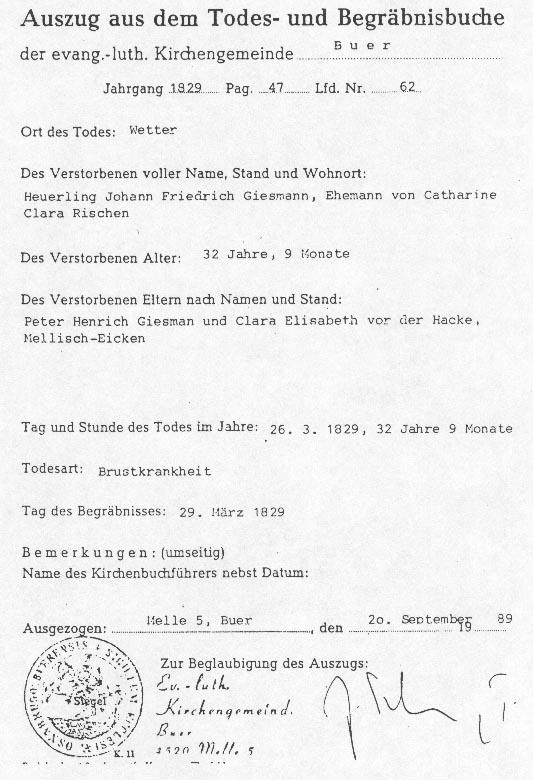 Extracted Melle 5, Buer on the 20th of Sept 1989 at the Certification or accreditation of the extract from Ev. Lutheran Parish of Buer 1520 Melle 5