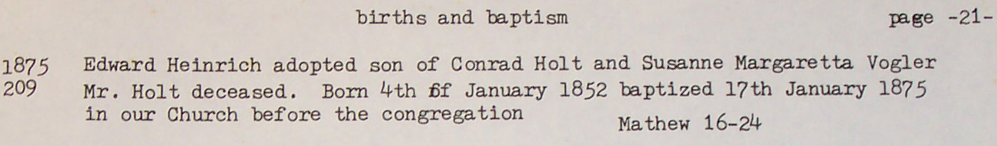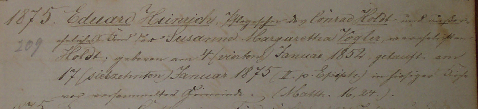 p.21 No 209 Edward Heinrich, pflegesohn des Conrad Holdt - und ernstling eheliches kind der Susanna Margaretha Vogler, wereheleister Holdt;geboren am 4 (_______) Januar 1852, getauft am 17 (siebxehnten) Januar 1875 (II jo. Epipls)