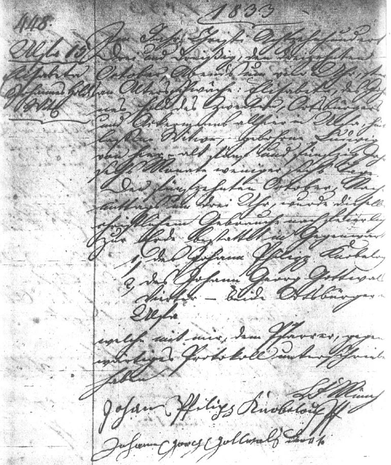 In the Year of our Lord eighteen hundred thirty three, the thirteenth of October, at about four o'clock in the evening, died of old age, Elisabeta, nee Ludwig, surviving widow of Johannes Hold the Second, local citizen and farmer here in Ulfa, age fifty five years, six months minus six days. On the fifteenth of October, at about three o'clock in the afternnon, according to Christian custom, the same was ceremonially commited to the earth, in the presence of