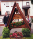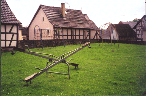 This was in a low level area of town and could have been the area where Ulfa got its name. Oloffe (original name of Ulfa) meant marshland. Near here we saw a small building with the sign "Volksbank". That apparently was the "People's Bank" where Mr. Gottwalz was employed. We came to another bus stop. It appeared to be a teenage gathering place because there was a small group of bicycle riders talking to each other. Since the names of the two remaining bus stops were "Molkerei" (Dairy) and Ulfa Kindergarten, I imagine that this bus stop was "Molkerei" because as we walked along we came past some large typical German homes with big barns attached--definitely the older historical section here in the heart of the village, which had very likely housed many milk cows each evening in the years gone by. Now some open doors revealed stacks of wood or machinery but we saw or heard no animals.