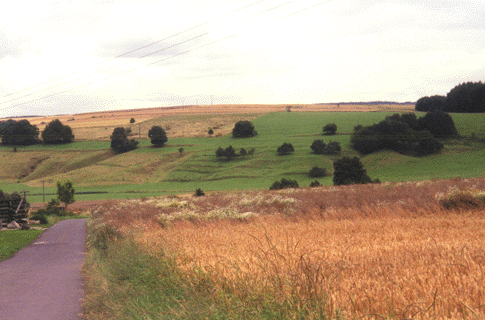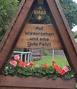 Once while we were resting on a bench, someone from about 100 feet away motioned and called for us to come down to their house. A lady introduced us to her mother, an 89 year-old-lady who had some information to share with us. She invited us into the home which she shared with her husband and her daughter and son-in-law. The older lady said that she had not known any Holts but had heard of some other names that were in our genealogical files. She also shared her ideas of things important in life. At one point in our chat we talked about flags of the various German provinces. Ray wanted to be sure that they meant flags and not coats of arms, so he asked about that. The German word for coat of arms is "Wappen" and the lady thought Ray had said "Waffen" the word for military weapons. She said Oh, No, that she had lived through two wars in Germany and she did not want that to happen again. Her daughter let her know the word Ray had used, but the conversation continued on that topic for a while. Ray mentioned that people from different countries getting to know each other would help avoid war. She said "Yes, and we all have the same God." Her husband said they had had 2000 chickens at one time in addition to other animals, but he had to go to war and his wife with 3 small children could not carry on with all the work. Things were never the same since. We were told most of Ulfa's residents now worked in near-by towns and some did a little farm work in the evenings. As we left I heard some pigs squealing as though they were being fed--perhaps by the son-in-law. A pile of manure was nearby . It had evidently been forked out of the hoghouse and waiting to be hauled away. We saw a few small tractors and wagons being driven along the street, but very few cars.