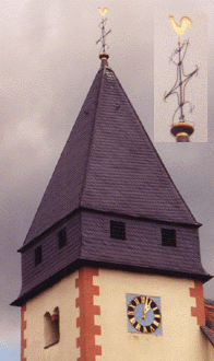The rooster signifies a protestant church. Inside this steeple is the oldest bell in the region, being cast in 1334. Now the bell is rung only on New Year's Eve. |