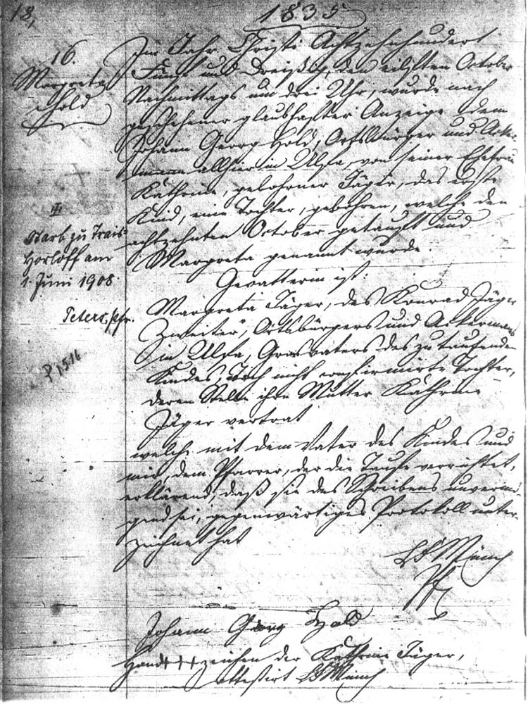 In the Year of our Lord eighteen hundred thirty five, the eleventh of October, at about three o'clock in the afternoon, according to duly made notification, was born to Johann Georg Hold, local citizen and farmer here in Ulfa, and his wife Kathrina nee Jäger, the first child, a daughter, which was baptized on the eighteenth of October and named Margreta.
