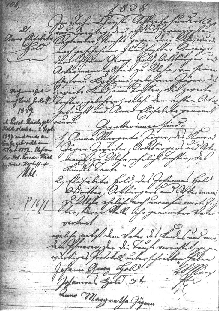 In the Year of our Lord eighteen hundred thirty eight, the twenty eighth of September, at about three o'clock in the night, according to duly made notification, was born to Johann Georg Hold, local citizen and farmer here in Ulfa, and his wife Kathrina nee Jäger, the second child, a daughter, the second daughter, which was baptized on the eighth of October and named Anna Elisabeta.