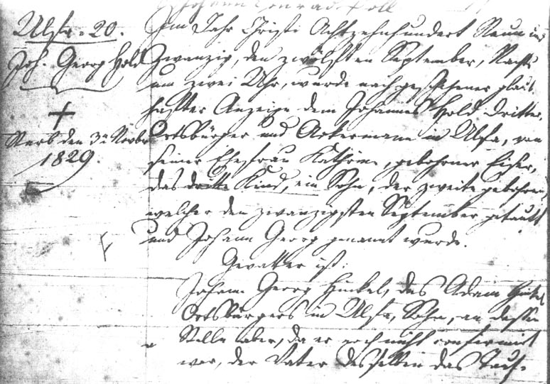 Im Jahr Christi Achtzehn Hundert Neun und Zwanzig, den Zwölften September, Nachts um zwei Uhr, wurde nach geschehener glaubhafter Anzeige dem Johannes Hold Dritter, Ortsbürger und Ackermann in Ulfa, von seiner Ehefrau Kathrina gebohrne Eißer, das dritte Kind, ein Sohn, der zweite gebohren, welcher den zwanzigsten September getauft und Johann Georg genannt wurde.