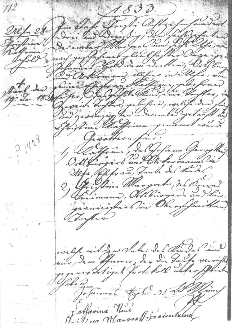 Im Jahr Christi Achtzehn Hundert Drei und Dreissig, den sechszehnten December, Morgen um sechs Uhr, wurde nach glaubhafter Anzeige, dem Johannes Hold dem Dritten, Ortsbürger und Ackermann allhier in Ulfa, von seiner Ehefrau Kathrina, gebohrner Eiser, das sechste Kind, eine Tochter, die zweite Tochter, gebohren, welche den fünf und zwanzigsten December getauft und Christine Kathrine genannt wurde.