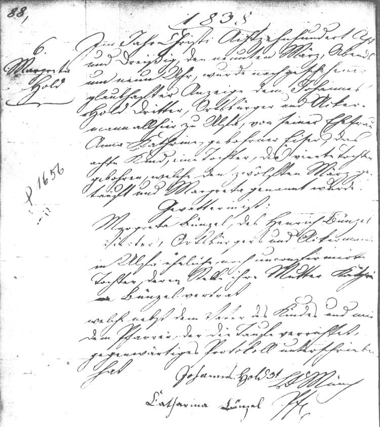 Im Jahr Christi Achtzehn Hundert Acht und Dreissig, den neunten März, Abends um neun Uhr, wurde nach geschehener glaubhafter Anzeige, dem Johannes Hold Dritter, Ortsbürger und Ackermann allhier zu Ulfa, von seiner Ehefrau Anna Kathrina, gebohrner Eiser, das achte Kind, eine Tochter, die vierte Tochter gebohren, welche den zwölften März getauft und Margreta genannt wurde.