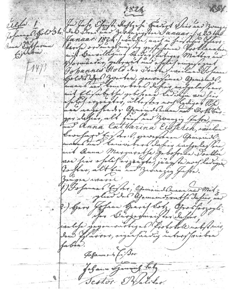 Im Jahr Christi Achtzehn Hundert Vier und Zwanzig den Drei und Zwanzigsten Januar (23ten Januar 1824) wurde, nach in hießiger Pfarrkirche ordnungsmäßig geschehenen Proklamation, mit Bewilligung beider seitiger Mütter und Vormunden, getraut und ehelich eingesegnet Johannes Hold der Dritte, weiland Johannes Holdes des Zweiten, gewesener Gemeinds-manns und Leinwebers dahier nachgelassener, mit Elisabetha gebohrene Ludwigin von hier ehelich erzeugter, ältester noch lediger Sohn, neu angehender Gemeindsmann und Ortsbür-ger dahier, alt fünf und Zwanzig Jahre, und Anna Catharina Eisserin, weiland Leonhard Eißers, geweßenen Gemeinds-manns und Leinwebers dahier nachgelassene, mit Anna Margaretha gebohrene Doellin von hier ehelich erzeugte, jüngste noch ledige Tochter, alt Ein und Zwanzig Jahre.