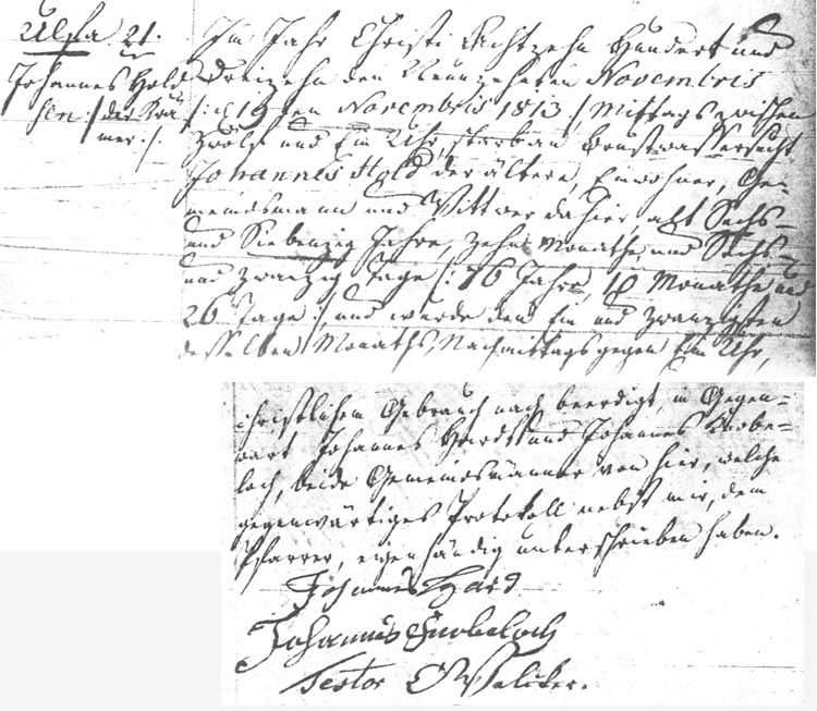 In the Year of our Lord eighteen hundred thirteen, the nineteenth of November (19 Nov 1813), mid-day between twelve and one o'clock, died of asthma, Johannes Hold the elder, inhabitant, citizen (with full rights) and widower here, age seventy six years, ten months, and twenty six days (76 years, 10 months and 26 days), and on the twenty first of the same month, in the afternoon going on 1:00 o'clock, was buried according to Christian custom, in the presence of Johannes Hardtl (?) and Johannes Kerbelach (?), both citizens from here, who, along with me, the pastor, personally signed the present record.