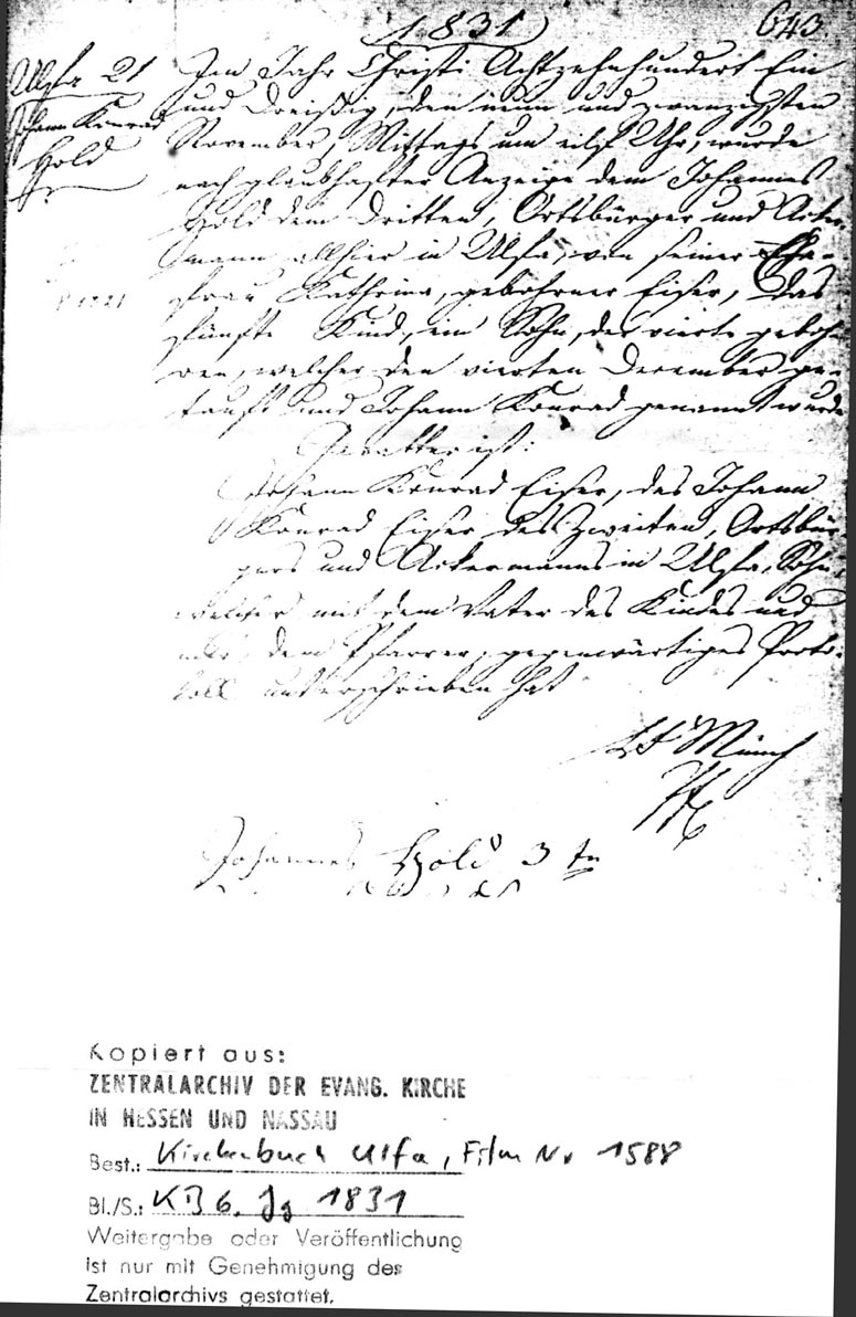 Im Jahr Christi Achtzehnhundert ein und Dreissig, den neun und zwanzigsten November, Mittags um eilf Uhr, wurde nach glaubhafter Anzeige dem Johannes Hold dem Dritten, Ortsbürger und Ackermann allhier in Ulfa, von seiner Ehefrau Kathrina, gebohrner Eiser, das fünfte Kind, ein Sohn, der vierte gebohren, welcher den vierten December getauft und Johann Konrad genannt wurde.
