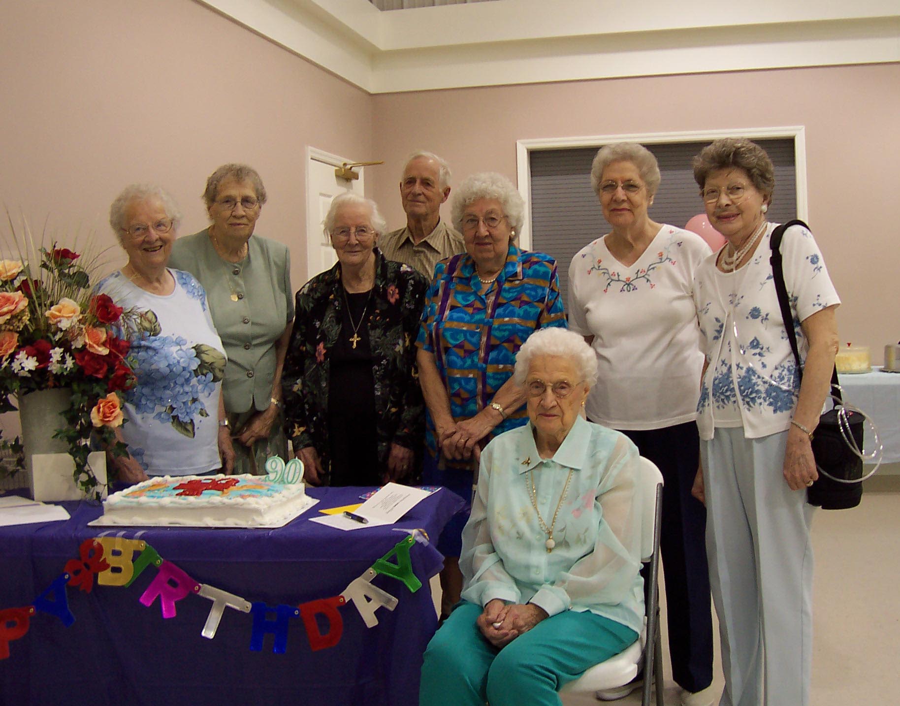 Cousins Edith (Rathje) Stephens, Coradina (Rathje) Mitchell, Lillian (Rathje) Demien, Herman Rathje, Pearl (Rehmeier) Wilmer, Anna Lee (Buemer) Hollander and Darlene (Buemer) Williams are standing behind Miriam