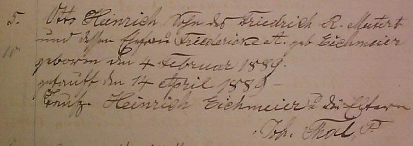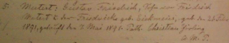 Mutert: Gustav Friedrich, son of Fredrich Mutert and wife Freiedricka born Eickmeier born 21 Dec 1891 .... 7 Maar 1891. Sponsor Christian Joerling