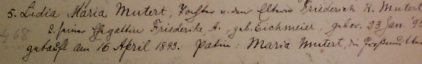 Lydia Maria Mutert, daughter of Friederich N. Mutert and ?, born 20 Jan '98.