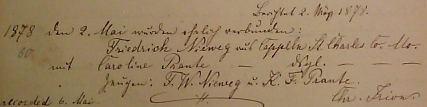 1878 May 2 Friedrich Nieweg Cappeln St. Charles Co., Mo and Carolline Prante, Cappeln, St. Charles, Co. Mo. were united in marriage.