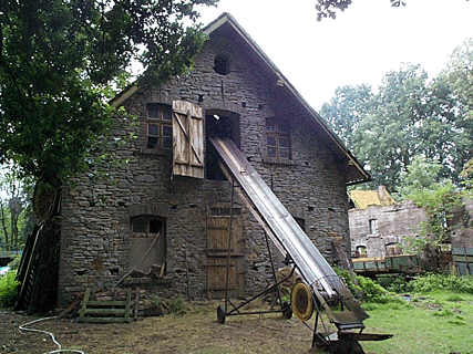 next to the remaining house, containing pigs