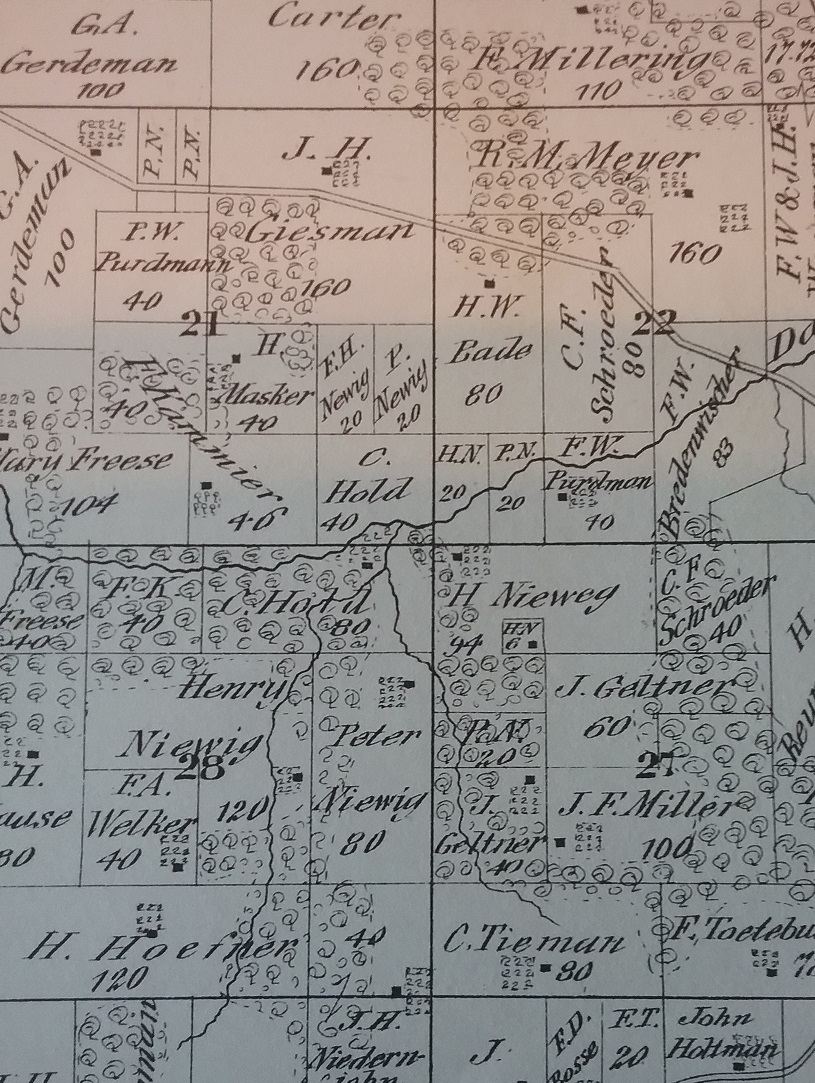 Sources: The Niewegs in Germany and America, Cracker Barrel News by Bill Schiermeier, 1975 Platte Map of St. Charles Co.,