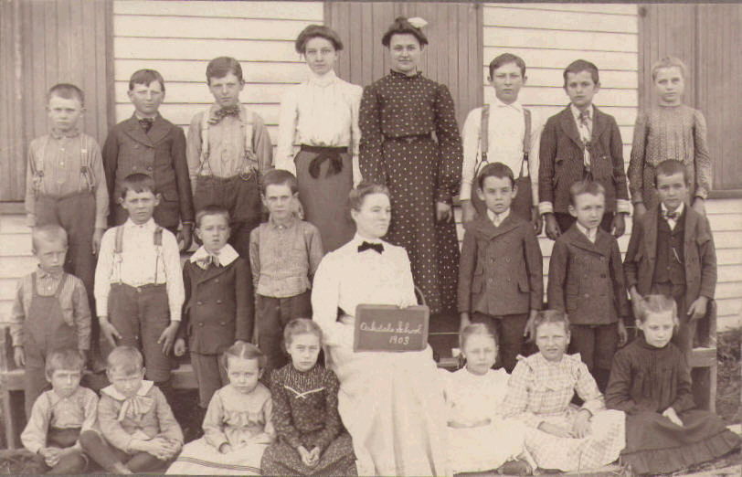2nd row: Harold Pierce, Johnny Nierman, Tom Edwards, Leonard Anselm, Teacker Alice Miller, Glen and Dale Johnson, Emil Schemmer