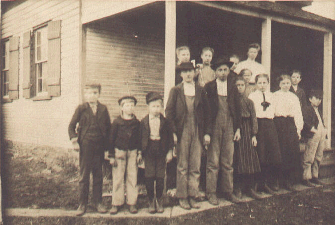 back: Dena (Nieweg) Nagel, Edna Lowe, ?, Lizzie (Nieweg) Almeling in front of teacher front: Emil Schemmer, Edgar Borgelt, Arthur Loewe, Sam Schemmer, Charles Busdieker, Carrie Busdieker, Hilda (Schemmer) Holt, Amanda (Giessman) Marsch, Johnny Nierman?, Harold Pierce