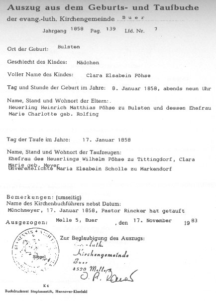 Birth Record of Clara Elsabein "Wilhelmina" (Poese) Schlewing