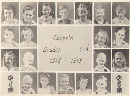 top: teacher Mabel Busdieker, Jim Riggs, Norma Maschmeier, Gerald Schiermeier, Shirley Ellerman, Norman Pauk, Bette Gabette, 2nd row: Butch Riggs, Opal Paul, Arlene Paul, Norbert Micke, 3rd row: Hazel Wildschuetz, Bobby Schmidt, Erwin Brakensiek, Elaine Welge, Bottom row: Ronald Pauk, Rose Holtmann, Wesley Brakensiek, Dorothy Jones, Lavon Schmidt